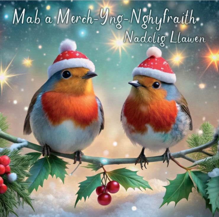 This enchanting Christmas card features two robins in Santa hats perched amidst snow-dusted holly. With soft lighting and a magical glow, it’s the perfect combination of festive and heartwarming.  A beautiful Welsh card for your Son and Daughter-in-Law.