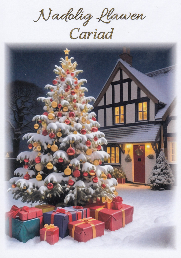 Message inside card: Nadolig Llawen a Blwyddyn Newydd Dda, translates as 'Merry Christmas and a Happy New Year'.