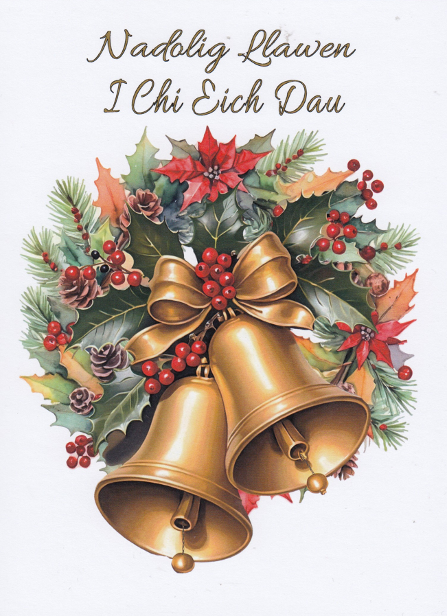 Message inside card: Nadolig Llawen a Blwyddyn Newydd Dda, translates as 'Merry Christmas and a Happy New Year'.