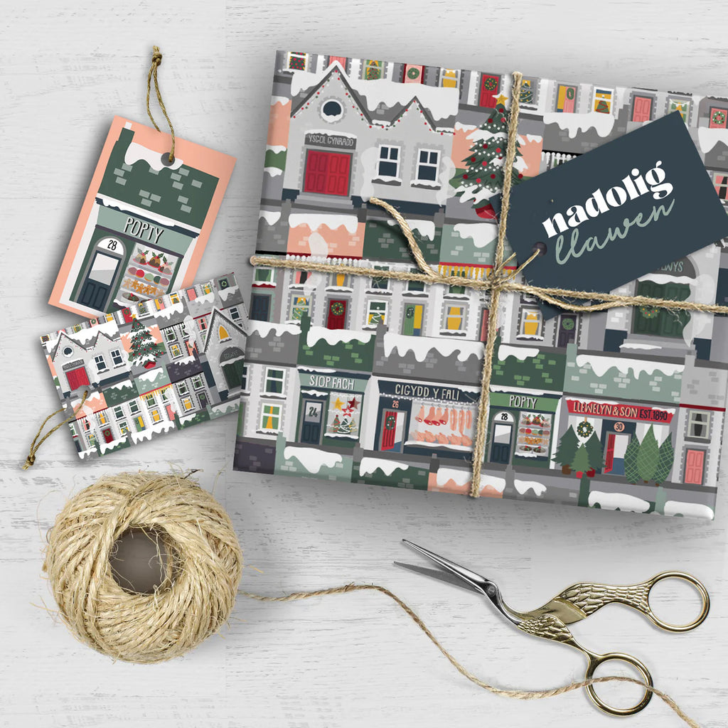 Mae'r pecyn yma yn cynnwys 2 daflen o bapur lapio A2 gyda 3 tag. Mae'r cynllun yn cynnwys dyluniad 'Pentref Nadoligaidd' gyda llun o strydoedd di-ri gyda'r ffenestri wedi eu haddurno yn Nadoligaidd ac eira wedi disgyn ar yr adeiladau - perffaith ar gyfer lapio rhai o'ch anrhegion eleni.