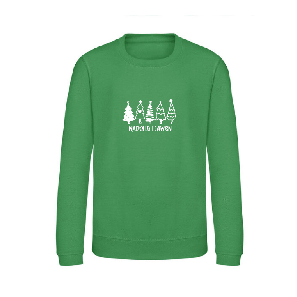 Siwmper Nadolig mewn gwyrdd gyda cynllun coed Nadolig ar y blaen mewn gwyn ar gyfer plant 1-13oed ac oedolion XS i 3XL.