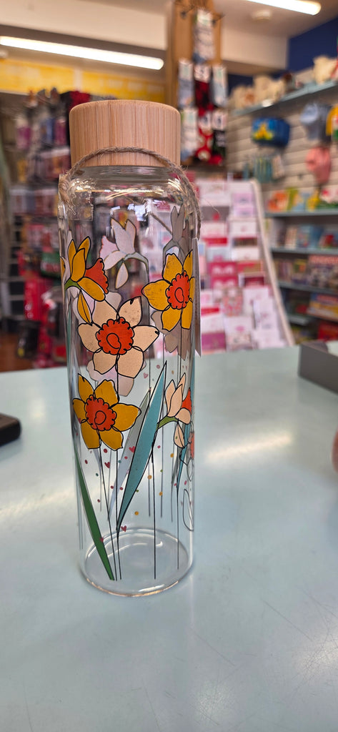 Beautiful borosilicate glass water bottle featuring a gorgeous daffodil wrap-around design with bamboo lid.