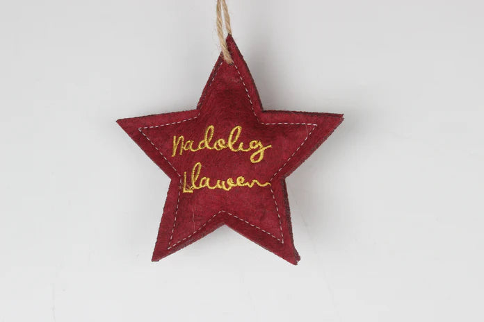 Beautiful hanging soft felt star shaped hanger for decorating your Christmas tree featuring the words 'Nadolig Llawen' which translates as 'Merry Christmas'.