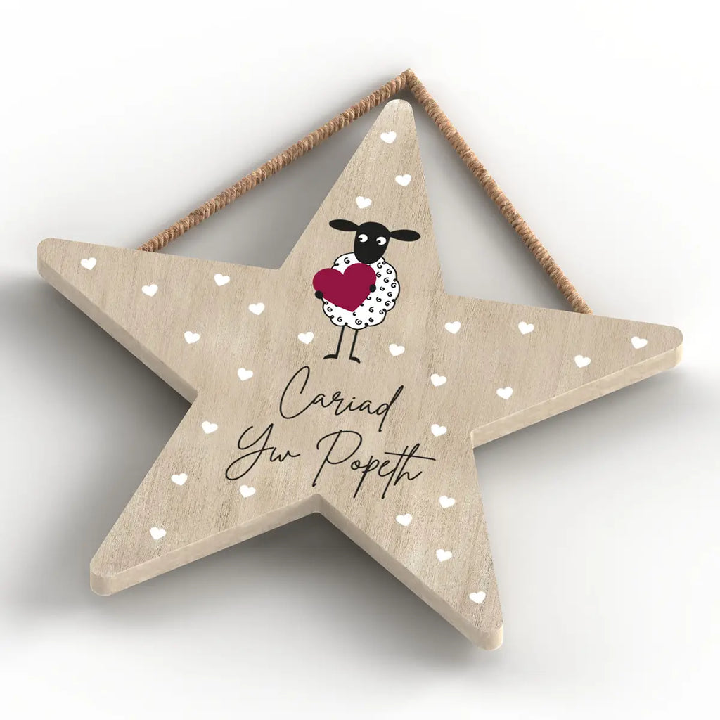 Wooden rustic style hanging star plaque with an adorable sheep themed design and the words 'Cariad yw Popeth' which translates as 'Love is Everything'.