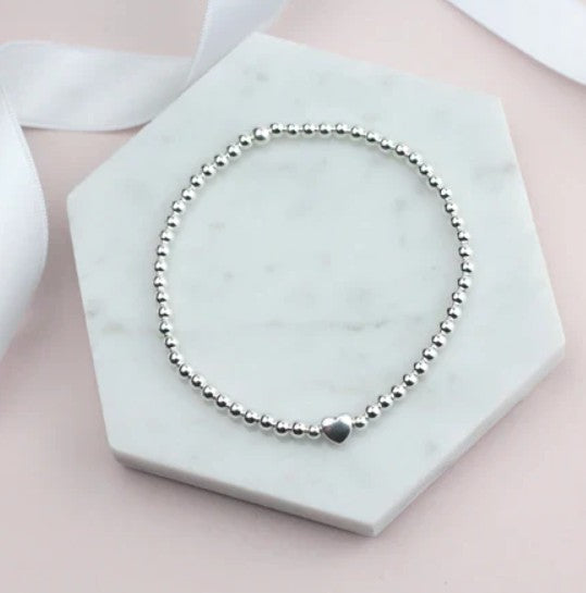 Breichled arian elastigedig gyda calon fechan arian fydd yn gwneud anrheg hyfryd i ddweud diolch o galon.