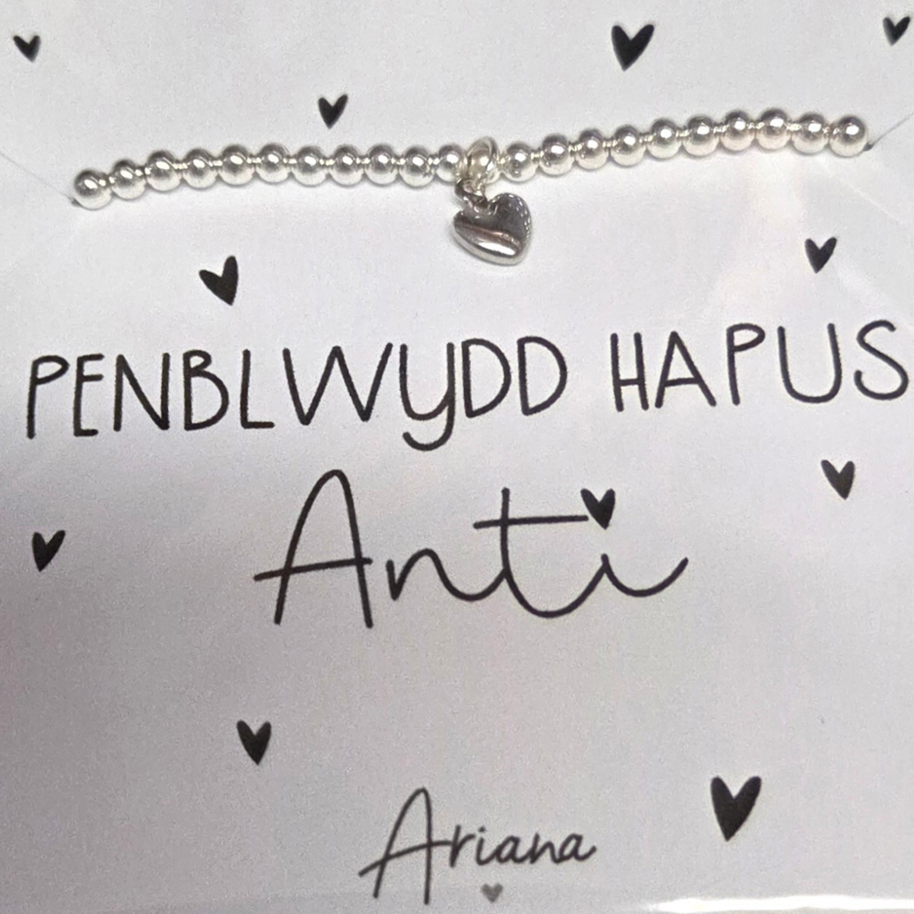 A lovely gift for your Auntie's birthday - a stretch bracelet, silver plated with a mini silver heart. Presented on a lovely gift card featuring the words 'Penblwydd Hapus Anti' which is Welsh for Happy Birthday Auntie.