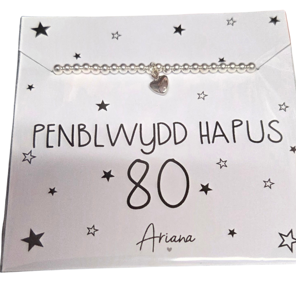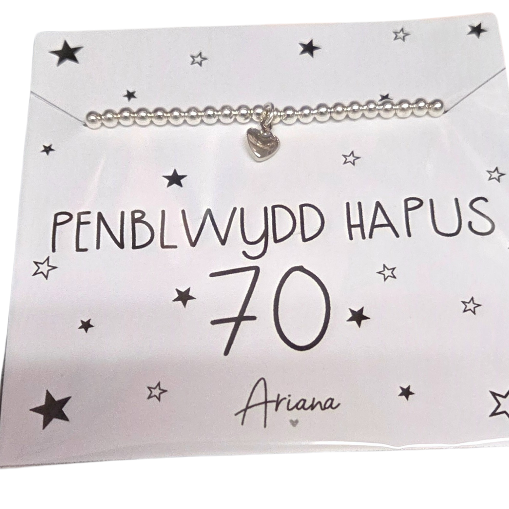 A lovely gift for that special birthday - a stretch bracelet, silver plated with a mini silver heart. Presented on a lovely gift card featuring the word Penblwydd Hapus which is Welsh for Happy Birthday. Available with the age 18, 21, 30, 40, 50 60, 70 and 80 featuring on the gift card.