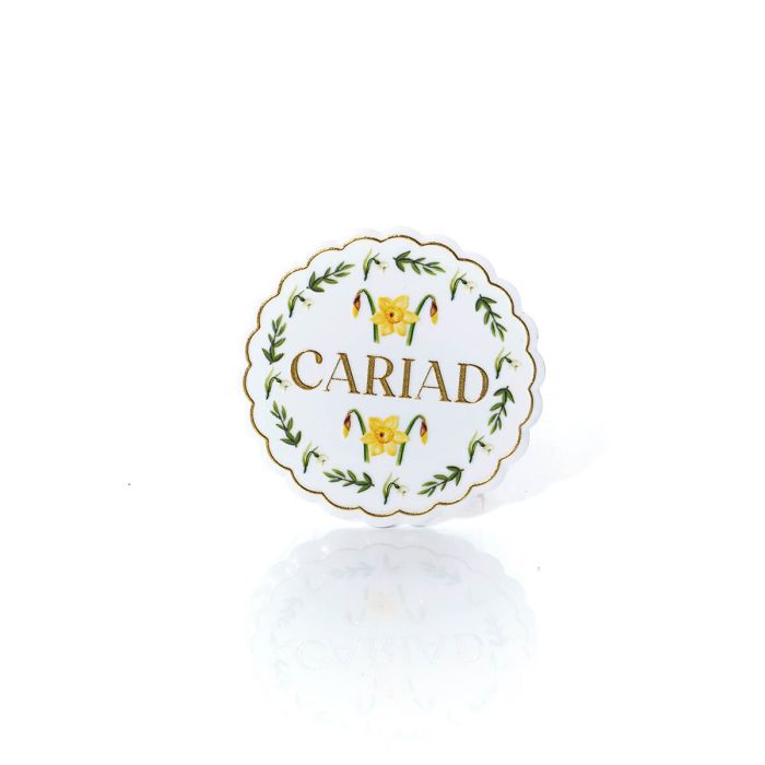 Welsh daffodil ceramic 3D raised detail with gold 'Cariad' scalloped coaster.