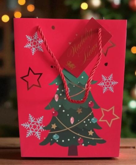 Cyflwynwch eich anrheg yn y bag papur moethus cynllun Nadolig sydd ar gael mewn dau maint.