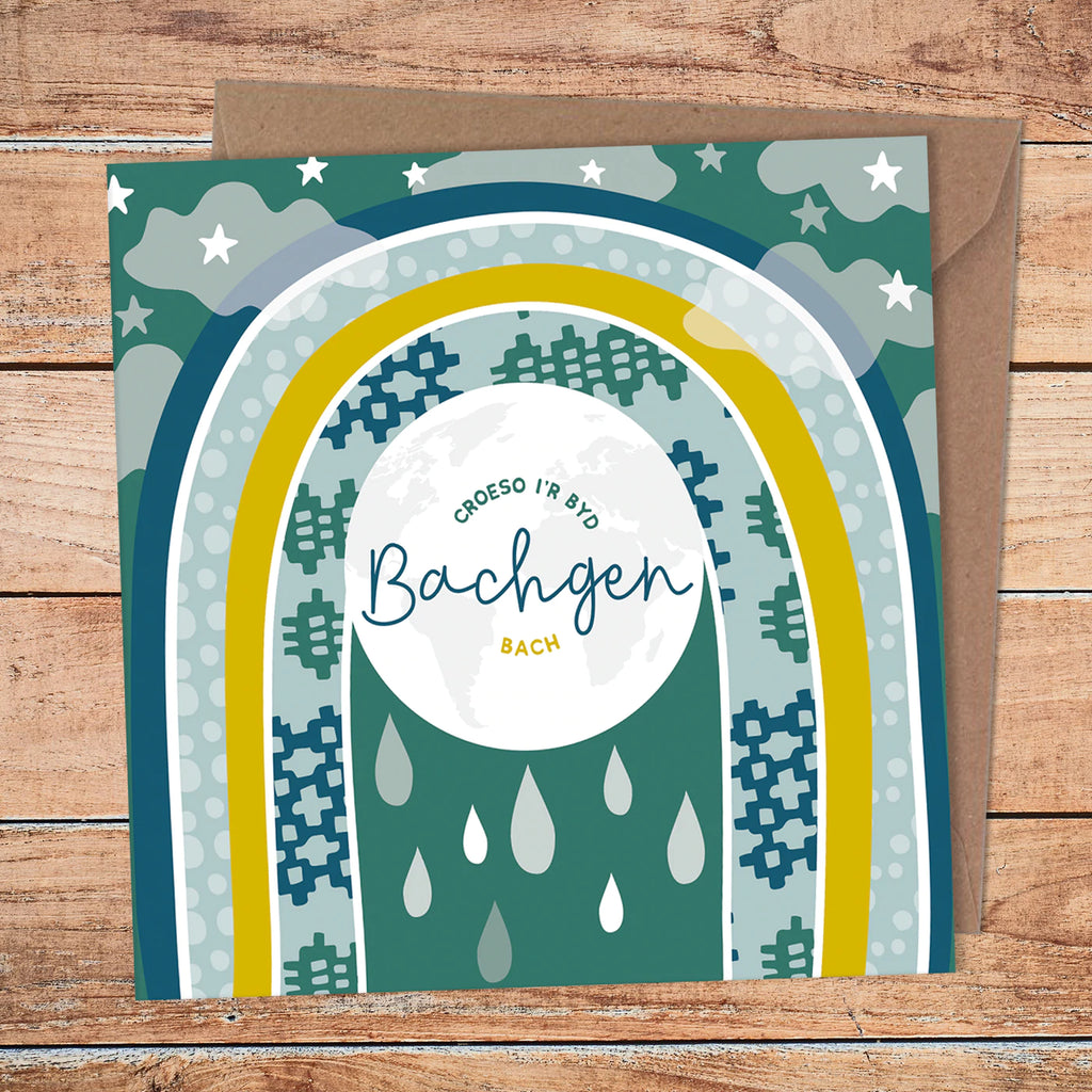 Cerdyn arbennig a lliwgar ar gyfer anfon eich nodyn arbennig i longyfarch y bachgen bach i'r Byd.