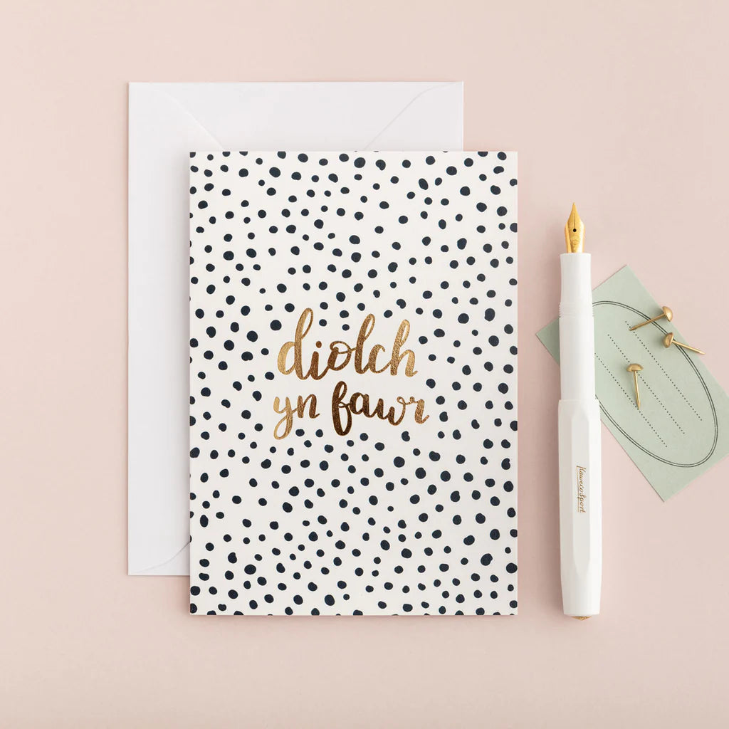 A luxury thick textured card finished with gold foil featuring the words 'Diolch yn Fawr'.