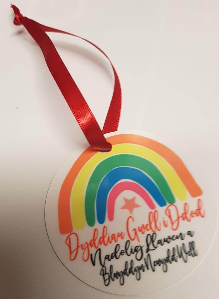 Decorate your Christmas tree with this gorgeous and colourful decoration made from aluminium, looped with a red ribbon featuring the words 'Dyddiau Gwell i Ddod - Nadolig Llawen a Blwyddyn Newydd Well' (which translates as 'Better Days to Come - Merry Christmas and a Better New Year').