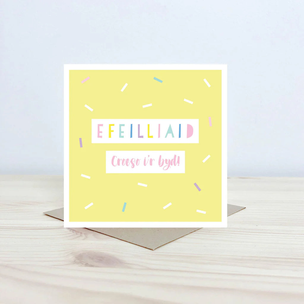 Cerdyn lliwgar hyfryd ar gyfer yr efeilliaid newydd.