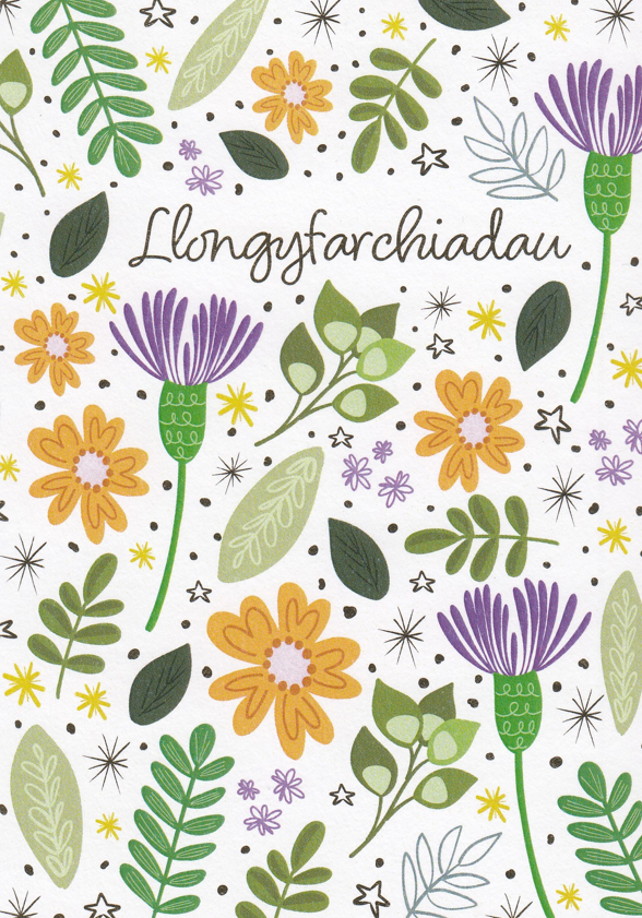 Beautiful floral card featuring the Welsh word 'Llongyfarchiadau' finished in stunning gold foil.