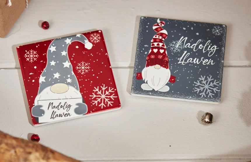 Gorgeous gonk ceramic coaster featuring the words 'Nadolig Llawen'; perfect for your Christmas table on the big day, or as a gift.