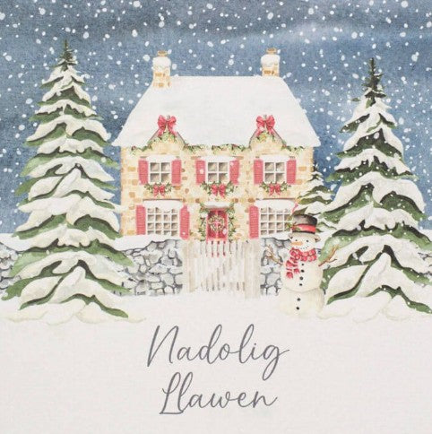 Lovely blank Welsh Christmas card for sending your best wishes featuring a watercolor illustration of a snow-covered cottage, pine trees, snowman, and the text "Nadolig Llawen" on the front, accompanied by a red envelope. Card features holiday-themed decorations in red, green, white, and blue tones.