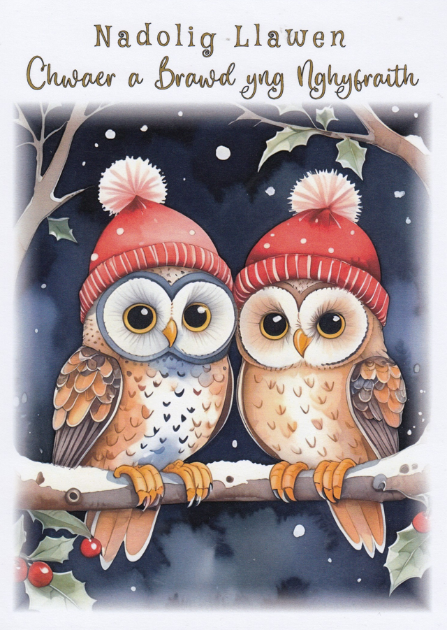 Message inside card: Nadolig Llawen a Blwyddyn Newydd Dda, translates as 'Merry Christmas and a Happy New Year'.