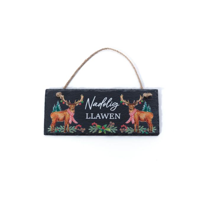 Rectangular slate plaque featuring two stags wearing red scarves, "Nadolig Llawen" text, Christmas foliage, pine trees, and attached hanging rope.