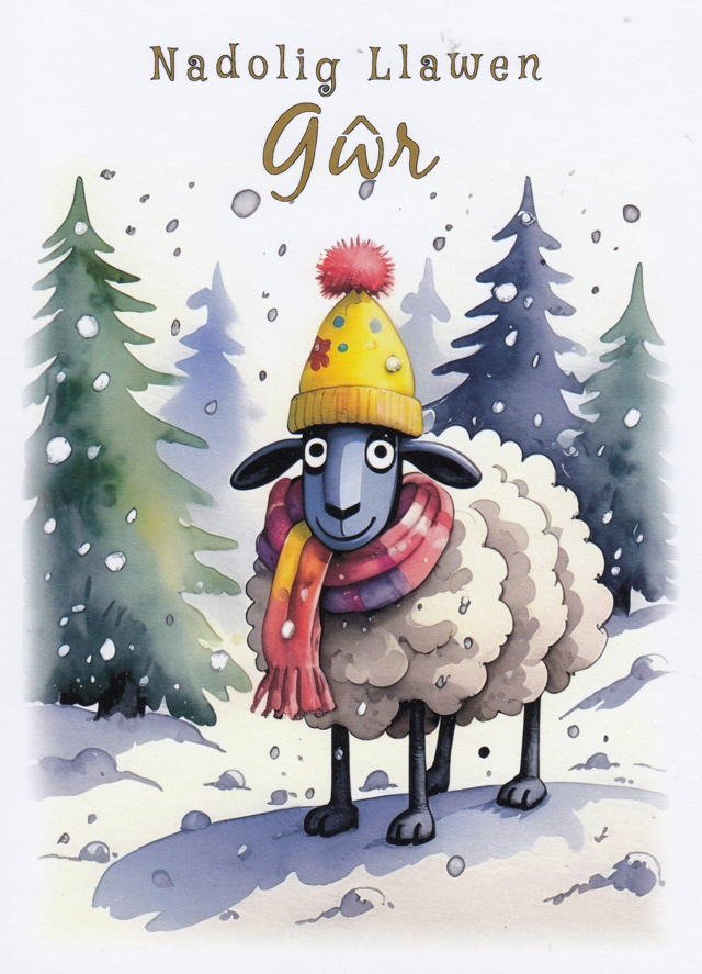 Message inside card: Nadolig Llawen a Blwyddyn Newydd Dda, translates as 'Merry Christmas and a Happy New Year'.
