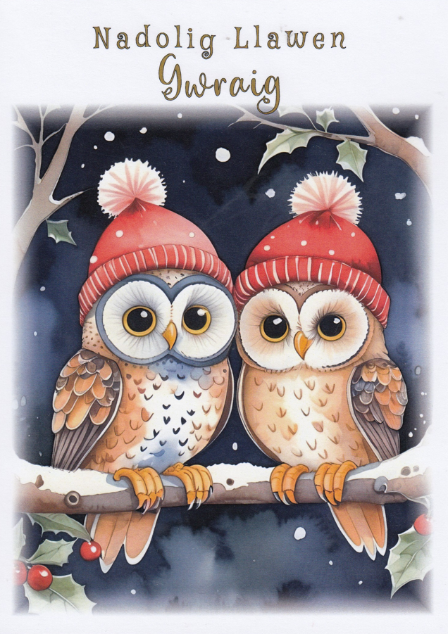 Message inside card: Nadolig Llawen a Blwyddyn Newydd Dda, translates as 'Merry Christmas and a Happy New Year'.