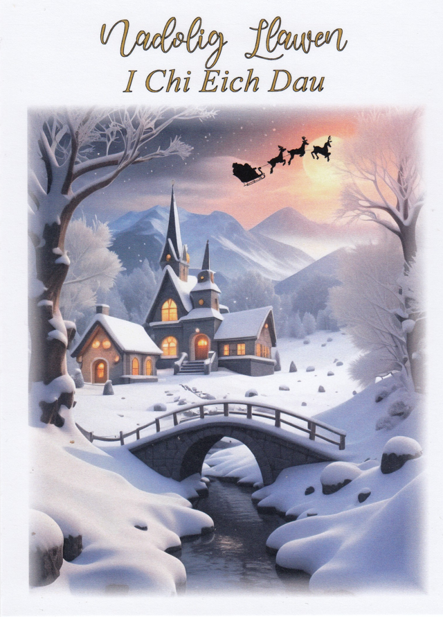 Message inside card: Nadolig Llawen a Blwyddyn Newydd Dda, translates as 'Merry Christmas and a Happy New Year'.