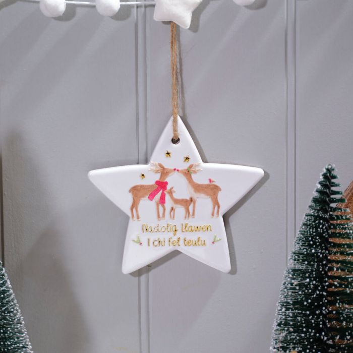 A lovely white Welsh hanging ceramic star featuring a raised design and the words 'Nadolig Llawen I Chi fel Teulu'.