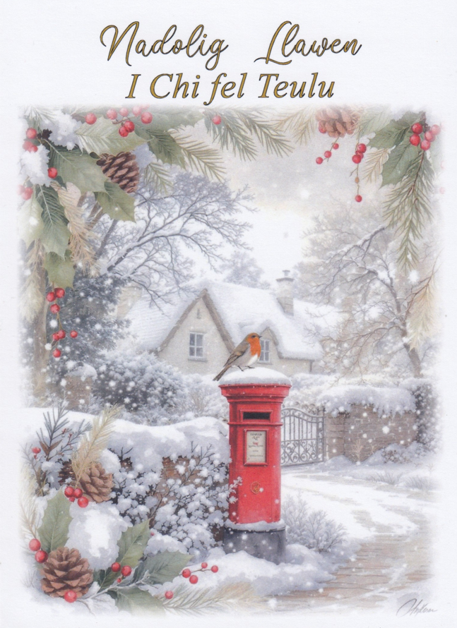 Message inside card: Nadolig Llawen a Blwyddyn Newydd Dda, translates as 'Merry Christmas and a Happy New Year'.