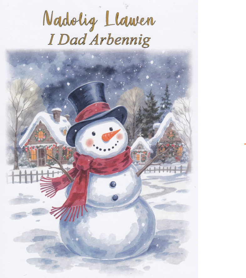 Message inside card: Nadolig Llawen a Blwyddyn Newydd Dda, translates as 'Merry Christmas and a Happy New Year'.
