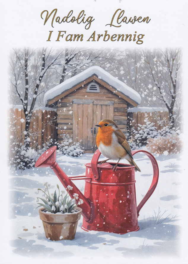 Message inside card: Nadolig Llawen a Blwyddyn Newydd Dda, translates as 'Merry Christmas and a Happy New Year'.