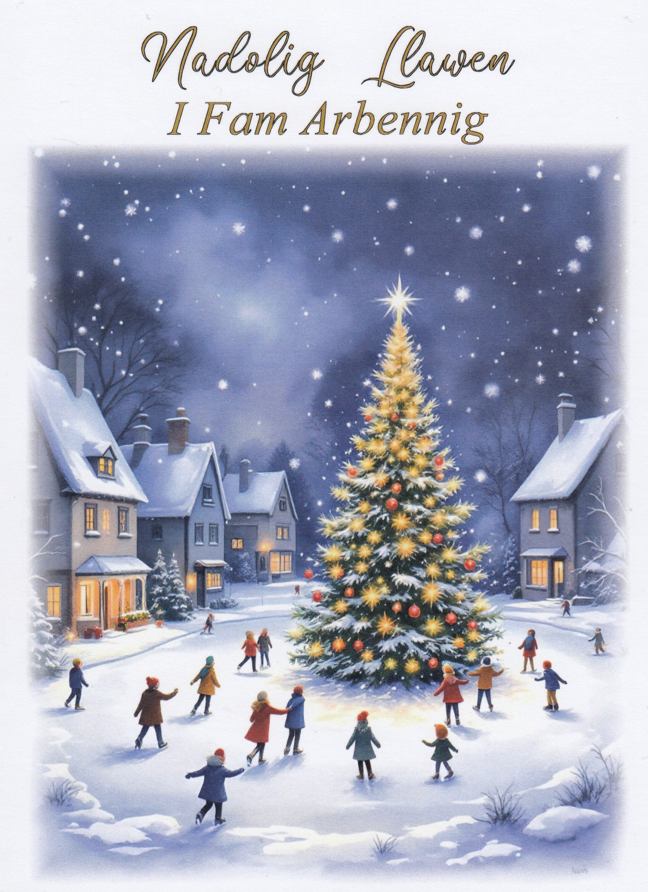 Message inside card: Nadolig Llawen a Blwyddyn Newydd Dda, translates as 'Merry Christmas and a Happy New Year'.