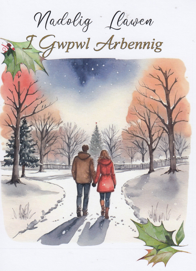 Cerdyn hyfryd ar gyfer anfon eich cyfarchion at gwpwl arbennig ar adeg y Nadolig.