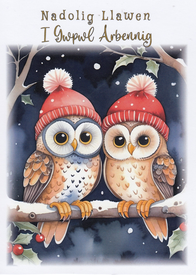 Message inside card: Nadolig Llawen a Blwyddyn Newydd Dda, translates as 'Merry Christmas and a Happy New Year'.