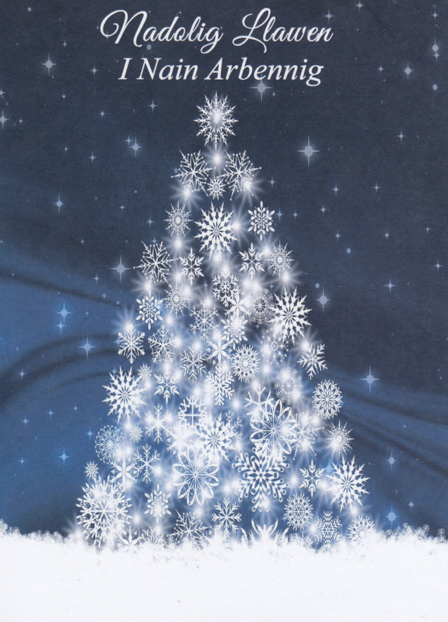 Message inside card: Nadolig Llawen a Blwyddyn Newydd Dda, translates as 'Merry Christmas and a Happy New Year'.