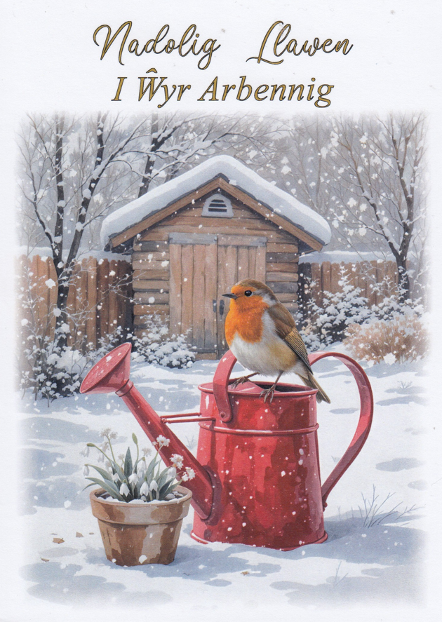 Message inside card: Nadolig Llawen a Blwyddyn Newydd Dda, translates as 'Merry Christmas and a Happy New Year'.