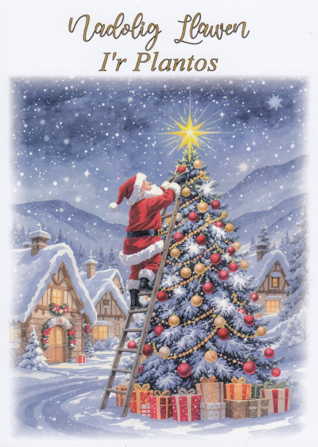 Message inside card: Nadolig Llawen a Blwyddyn Newydd Dda, translates as 'Merry Christmas and a Happy New Year'.