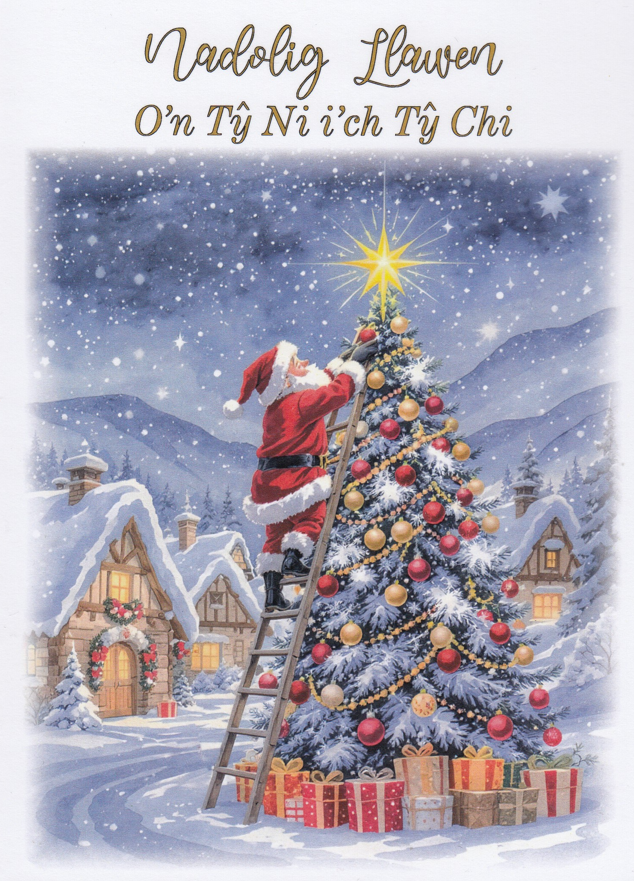 Message inside card: Nadolig Llawen a Blwyddyn Newydd Dda, translates as 'Merry Christmas and a Happy New Year'.