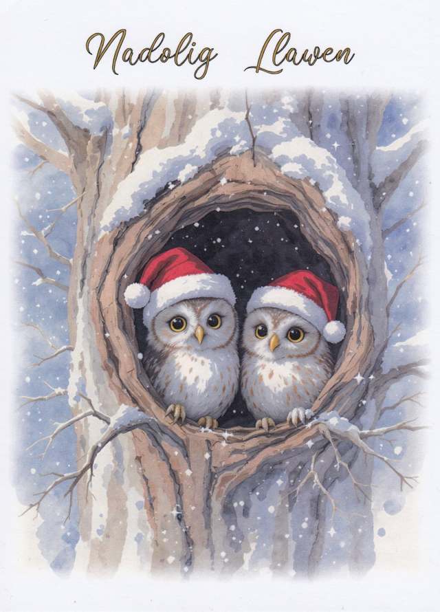 Message inside card: 'Nadolig Llawen a Blwyddyn Newydd Dda', translates as 'Merry Christmas and a Happy New Year'.