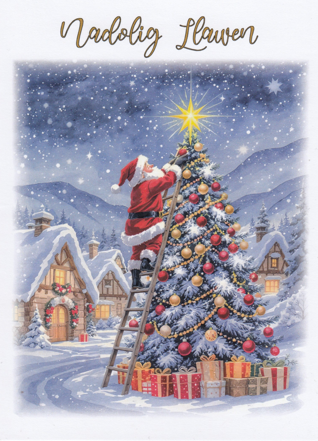 Message inside card: 'Nadolig Llawen a Blwyddyn Newydd Dda', translates as 'Merry Christmas and a Happy New Year'.