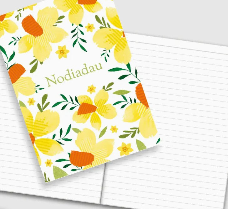 Llyfr nodiadau maint A5 gyda cynllun hyfryd efo'r gair 'Nodiadau' arno.