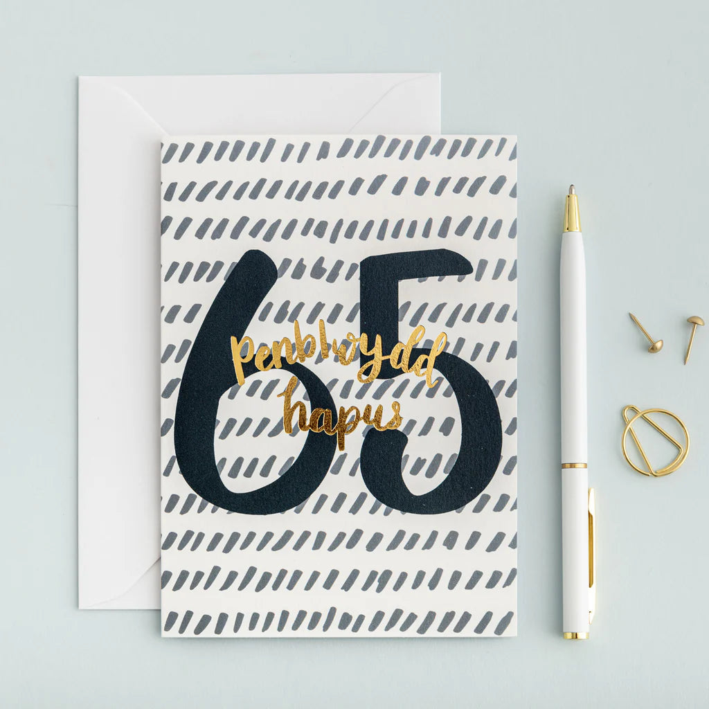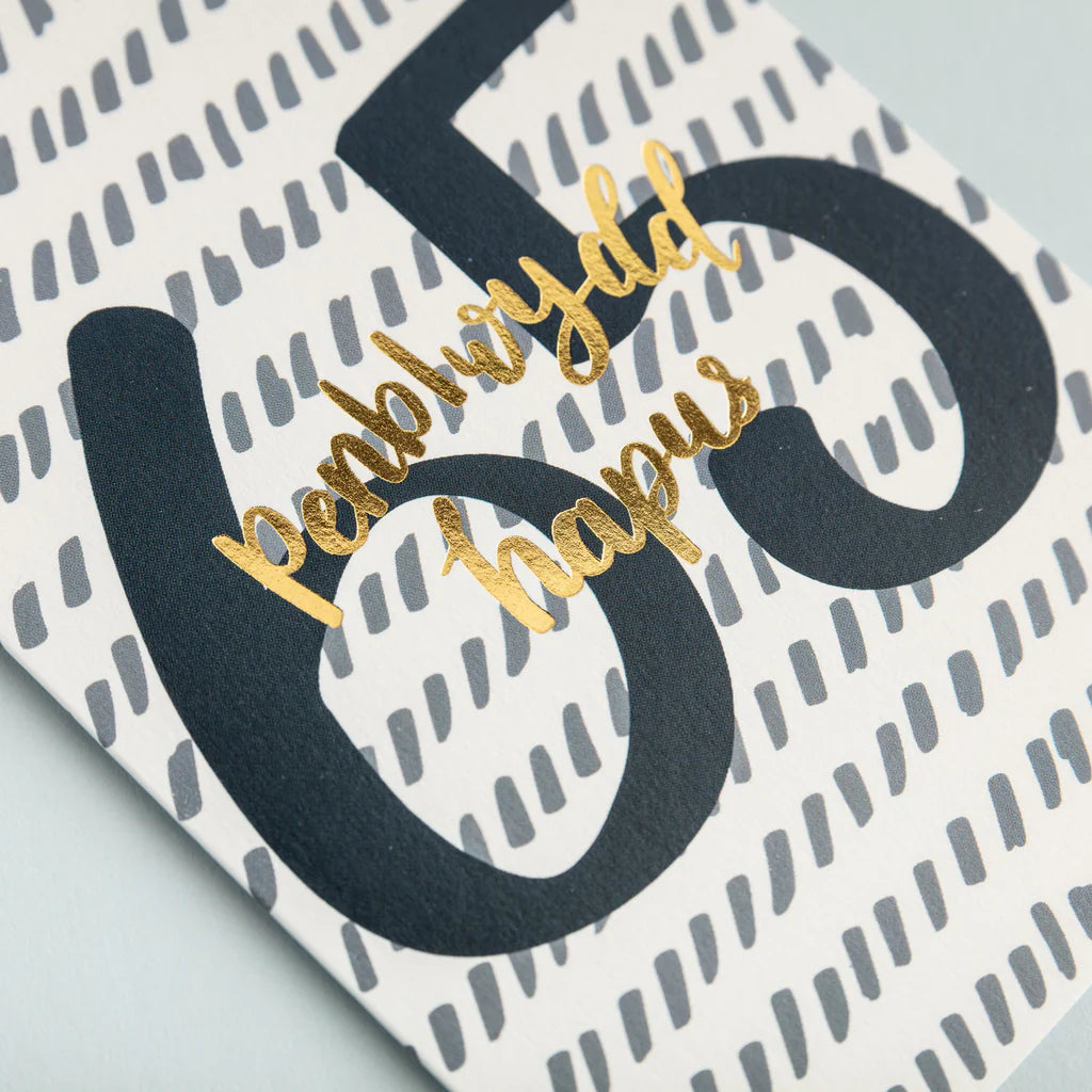 Cerdyn hyfryd wedi ei orffen gyda ffoil aur ar gyfer anfon eich cyfarchion am ben-blwydd arbennig yn 65oed.
