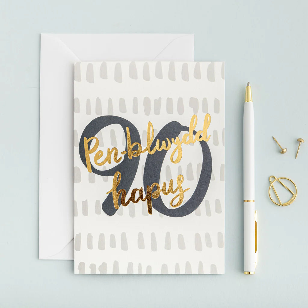 Cerdyn hyfryd wedi ei orffen gyda ffoil aur ar gyfer anfon eich cyfarchion am ben-blwydd arbennig yn 90oed.