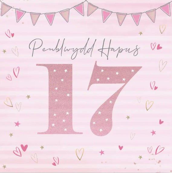 A Welsh language 17th birthday card. Celebrate the special milestone of turning 17 with this enchanting Welsh language 17th birthday card! This vibrant design features the number 17 in a lovely pink design.
