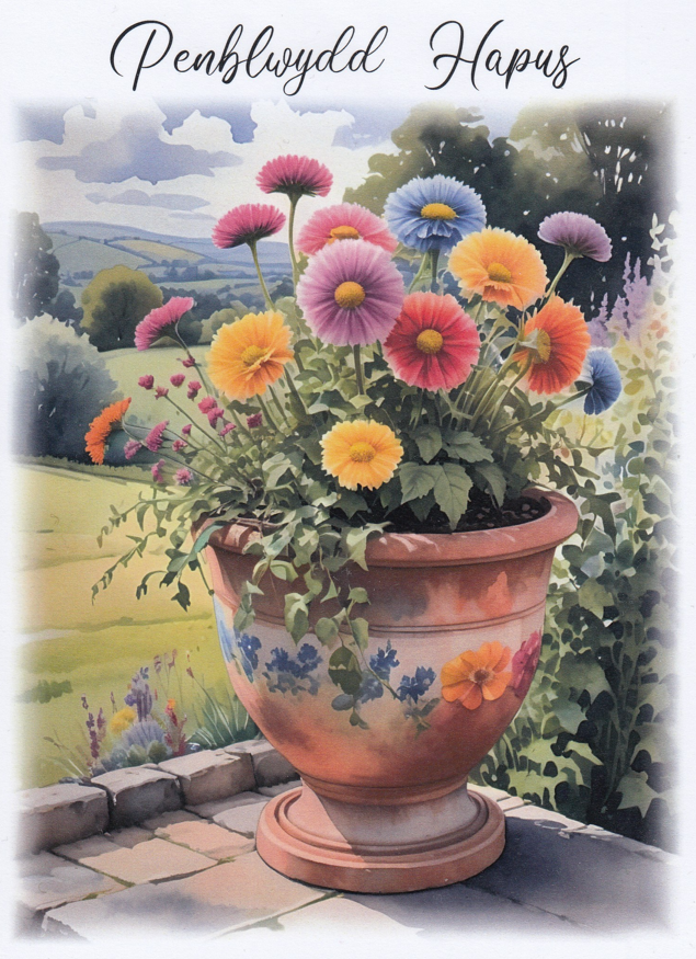 Beautiful Welsh birthday card featuring some gorgeous flowers for sending your greetings for a special day.