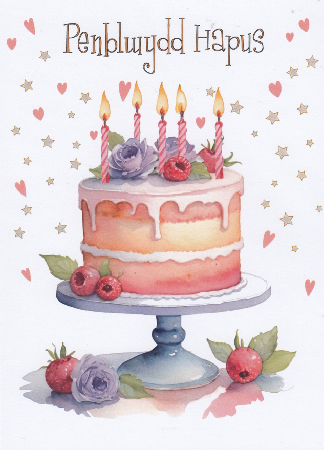 Beautiful Welsh birthday card featuring a gorgeous looking cake for sending your greetings for a special day.