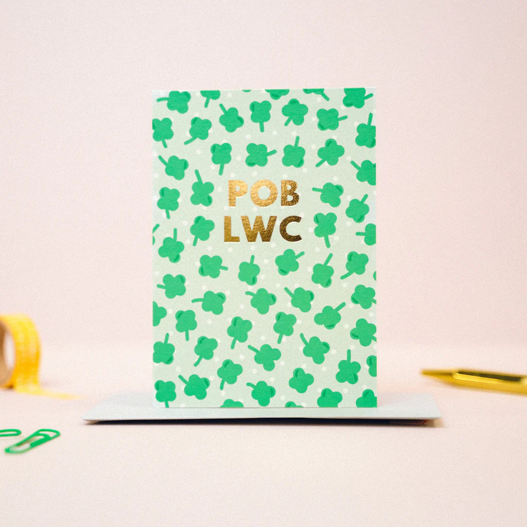 A luxury card finished with gold foil, featuring the words 'Pob Lwc' which is Welsh for 'Good Luck'.