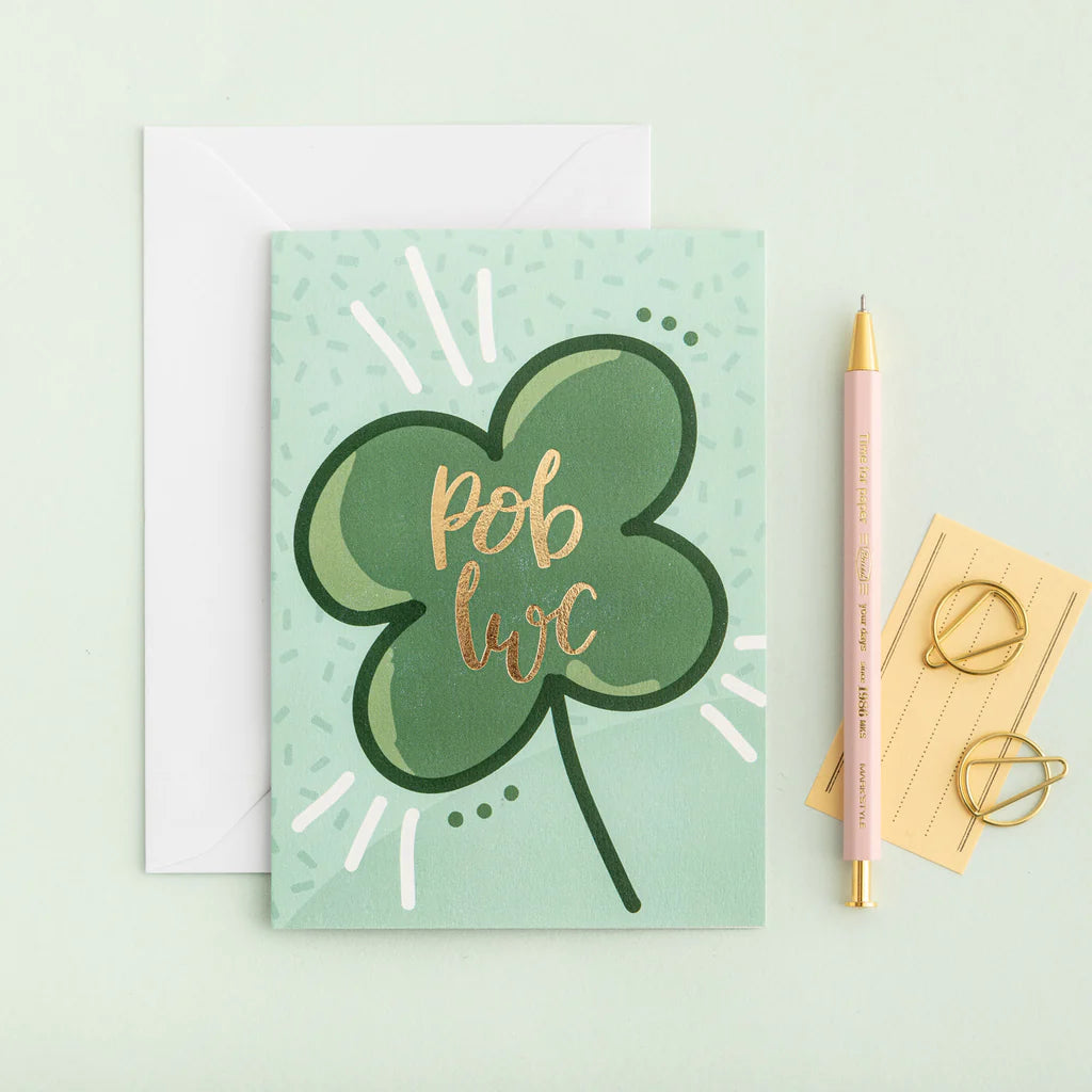 A luxury card finished with gold foil, featuring the words 'Pob Lwc' which is Welsh for 'Good Luck'.