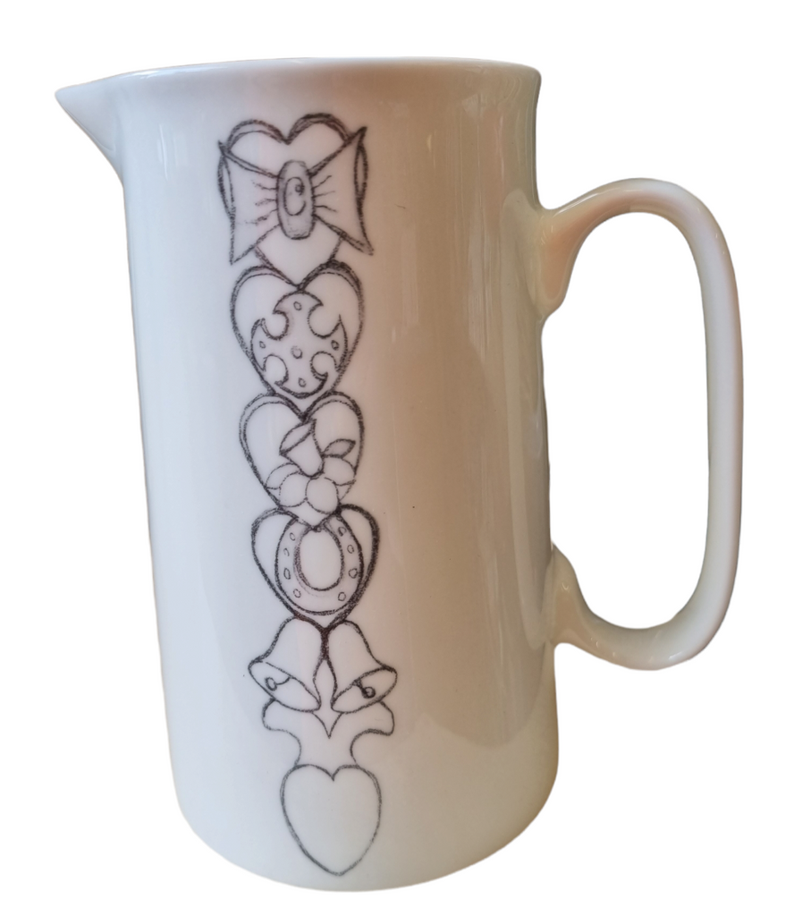 Gorgeous 2 pint fine bone china jug for a diamond wedding anniversary with the Welsh lovespoon on one side and the anniversary details on the other.