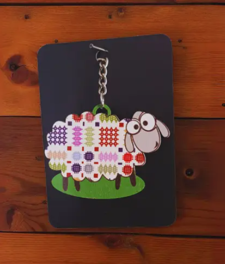 Delightful accessory - a lovely charm - wooden sheep keyring in striking rainbow Welsh tapestry design. Perfect for your keys or bag, this unique wooden sheep is an ideal keepsake for anyone who appreciates the beauty of Welsh craftsmanship.