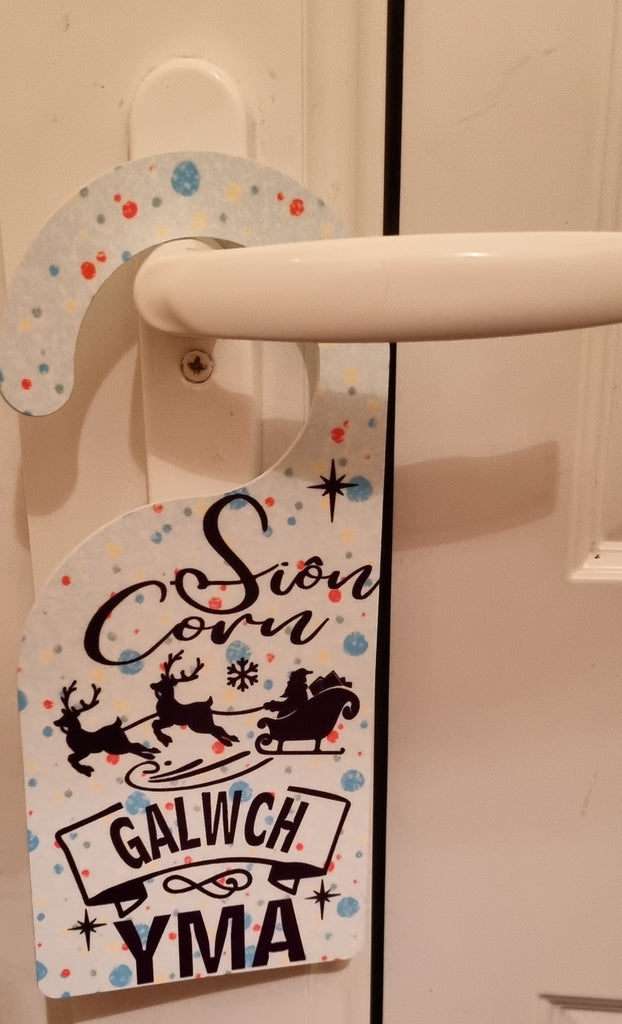 Place this door hanger so Santa knows to call with you! Features the words 'Siôn Corn, Galwch Yma' which translates as 'Santa, Call Here'.