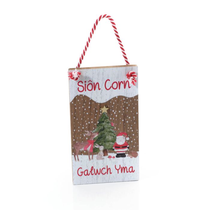 Beautiful hanging wooden childrens winter wonderland plaque featuring the words 'Sion Corn Galwch Yma' which translates as 'Santa, Please Call Here'!
